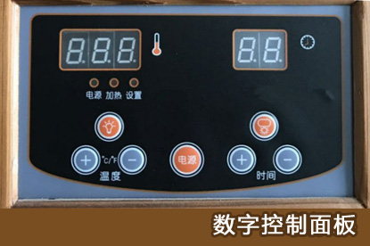 數(shù)字控制面板:數(shù)字傳感器,LED數(shù)碼顯示,智能恒溫控制,使用方便,節(jié)能省電。時(shí)間調(diào)節(jié)為0-60分鐘,溫度調(diào)節(jié)為18-60℃。
